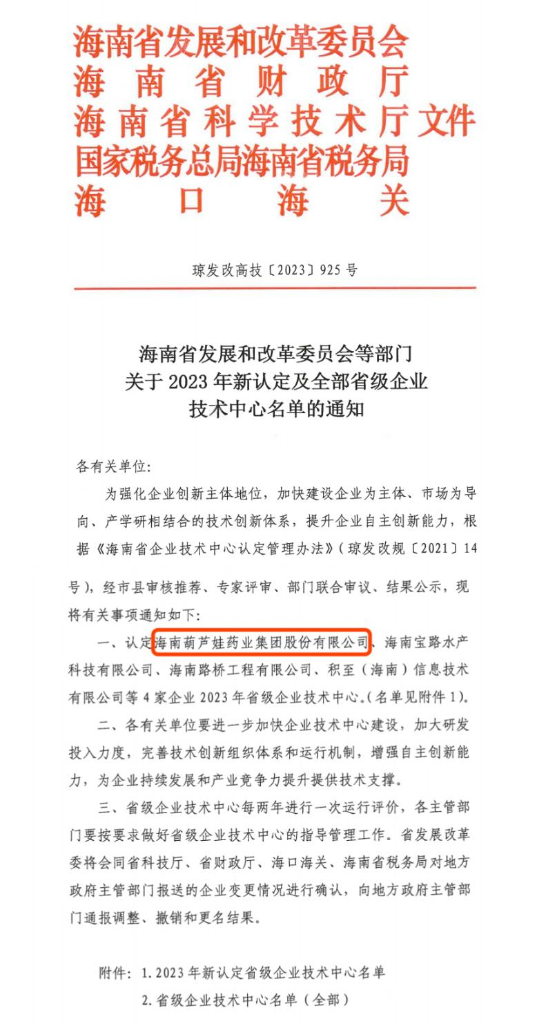 近日,海南省发改委等多部门联合公布了《关于2023年新认定及全部省级企业技术中心名单的通知》,其中,海南超凡国际药业集团股份有限公司成功通过评审,被认定为省级企业技术中心,是本次获批的4家企业之一。